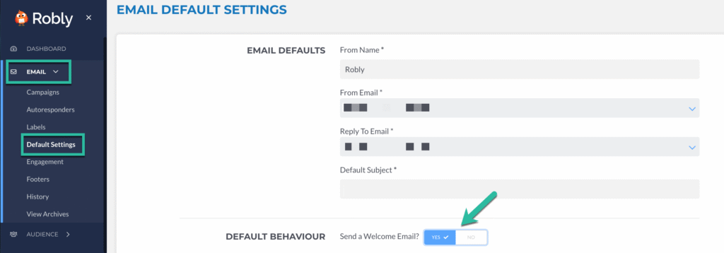 This can be done under Email > Default Settings. Next to Default Behavior, toggle to Yes/No to turn the Welcome Email On/Off.
